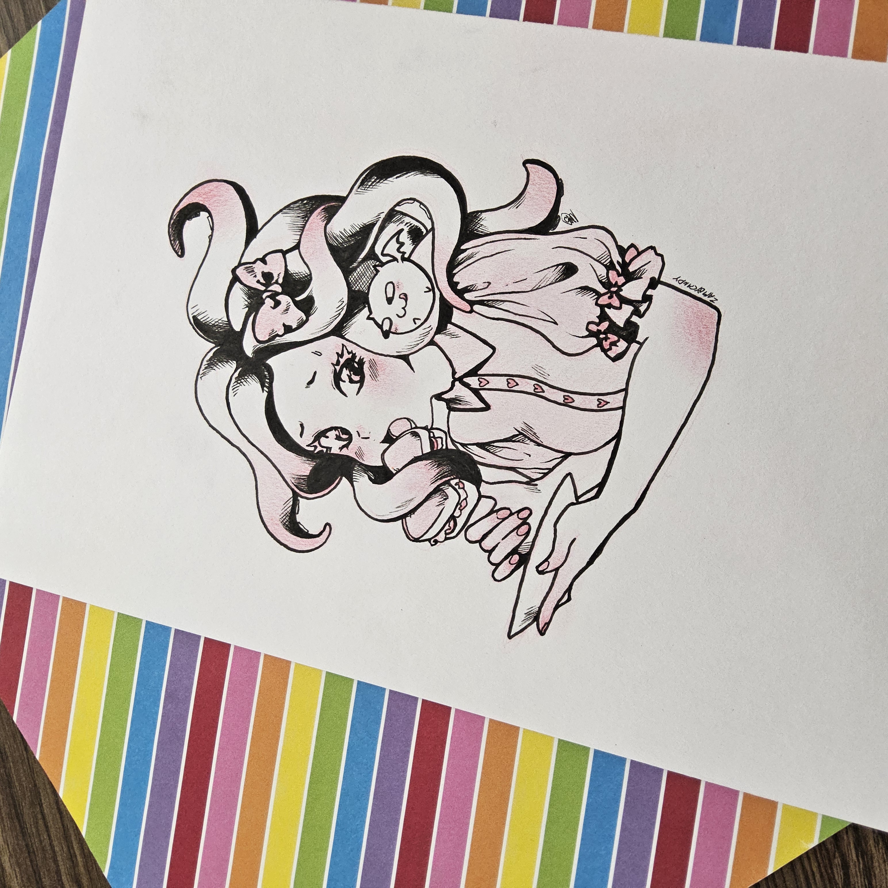 Done on Grumbacher mixed media paper. Drawn with a red Ticonderoga erasable pencil and Sakura Pigma sensei pen. This is coated with Krylon UV resistant acrylic coating. Photos taken around 9am in the morning. Left the photos slightly dark while editing so you could see the pencil. The paper is white.